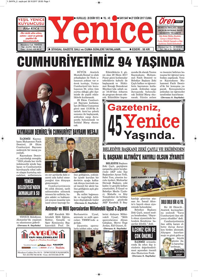 Yenice’nin tanınmamasının büyük sıkıntılarını çeken dönemin Belediye Başkanı merhum Sabri Akay tarafından 28 Ekim 1972 yılında yayın yaşamına sokulan ve daha sonra, önceki Belediye Başkanı Mustafa Akay yönetiminde 2004 yılına kadar yayın yaşamını sürdüren ve sahipliğini Deniz Elieyioğlu, Genel Yayın Müdürlüğünü Fahri Elieyioğlu ile Yazı İşleri Müdürlüğünü Ömer Yılmaz’ın yaptığı Yenice Gazetesi 45. yılını kutluyor.